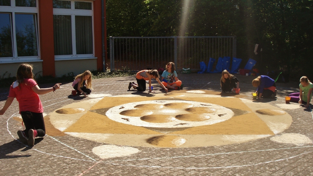 „ Liebes Terranova-Team, wir wollen uns auch auf diesem Wege noch einmal für eine tolle Woche bedanken. Im Rahmen des Projekts "Künstler für Schüler" haben die Projektleiter in unserer Grundschule „Eldekinder“ Grabow mit Viertklässlern ein beeindruckendes Sand-Bild gestaltet. Es wurde dem Motto "Sand-Urkraft-Werke als Lebenserfahrung" allemal gerecht. Der Prozess der Entwicklung, die Beschäftigung mit den Grundstrukturen der Blume des Lebens, das Gefühl mit seinem Sandeimerchen ein Stück zu dem großen Gesamtwerk beizutragen bleibt uns allen als einmaliges Erlebnis in Erinnerung. Gemeinsam mit der Klasse als Halma-Spiel gestreut, gehört auch das abschließende Spiel im Bild, das alles wieder zerstörte, zu einer Erfahrung.“